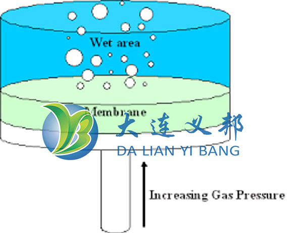 起泡點法測試原理:當微孔濾膜和折疊濾芯用一定的溶液完全浸潤,然后通過氣源在一側加壓(實驗儀器里面有進氣控制系統,可以穩定壓力,調節進氣),隨著壓力的增加,氣體從微孔濾膜的一側放出,表現為膜一側出現大小、數量不等的氣泡,通過儀器判斷出對應的壓力,判斷依據就是泡點。