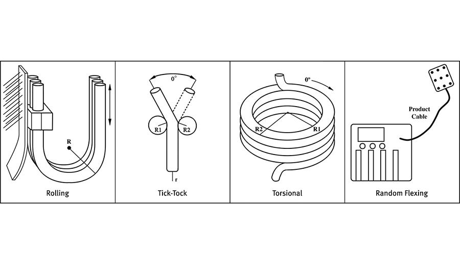 電纜如圖所示的四種基本運動中一種或多種方式彎曲,每一次電纜彎曲時其導體和屏蔽層都會受到壓力。金屬對抗重復應力的抵抗力較差,即使應力保持在15%伸長率的屈服點以下,金屬剪切應力的抵抗力也非常低,PBO鍍金屬高分子纖維就是為了替代金屬防波套而被研發。
