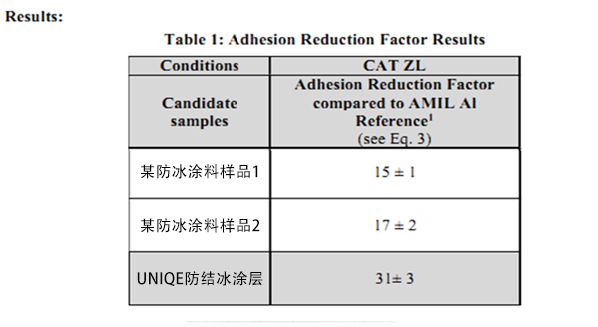 Uniqe防結冰涂料基于AMIL實驗室測試數據,可降低冰的粘附力90%以上